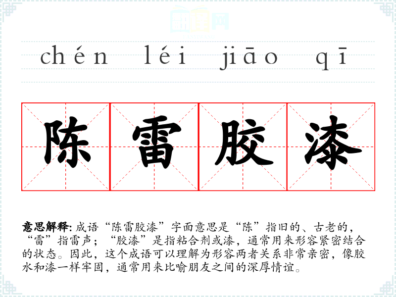 成语“陈雷胶漆”字面意思是“陈”指旧的、古老的,“雷”指雷声;“胶漆”是指粘合剂或漆,通常用来形容紧密结合的状态。因此,这个成语可以理解为形容两者关系非常亲密,像胶水和漆一样牢固,通常用来比喻朋友之间的深厚情谊。