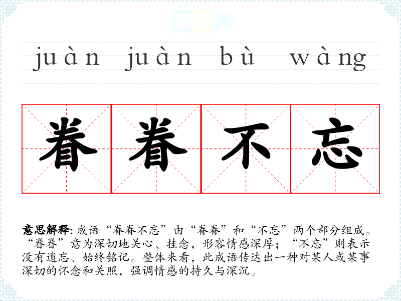成语“眷眷不忘”由“眷眷”和“不忘”两个部分组成。“眷眷”意为深切地关心、挂念,形容情感深厚;“不忘”则表示没有遗忘、始终铭记。整体来看,此成语传达出一种对某人或某事深切的怀念和关照,强调情感的持久与深沉。