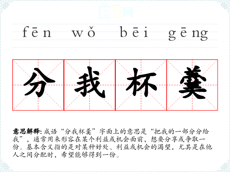 - 细微差别:这些成语表示对利益的无欲无求,与“分我杯羹”的积极争取形成鲜明对比。