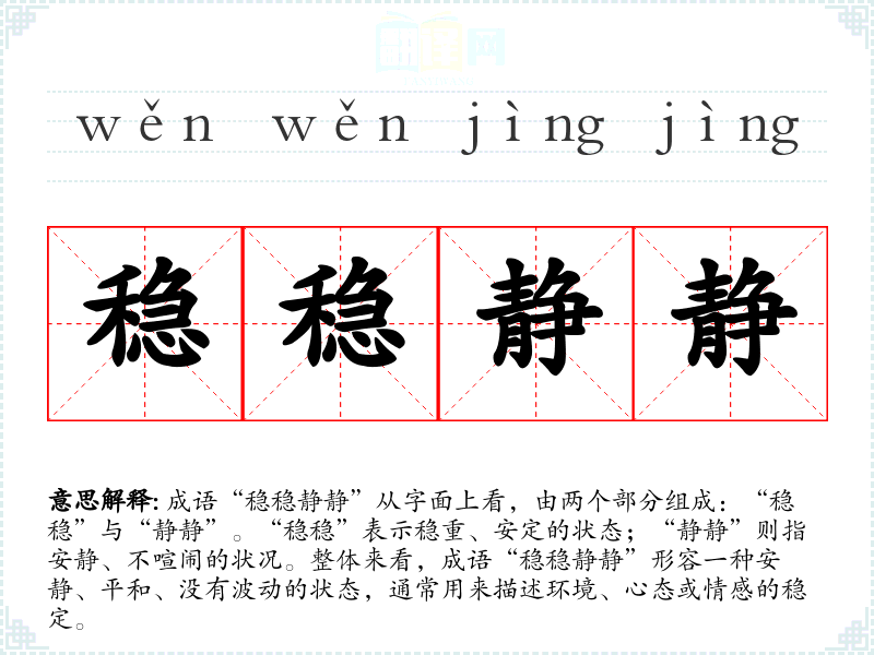 成语“稳稳静静”从字面上看,由两个部分组成:“稳稳”与“静静”。“稳稳”表示稳重、安定的状态;“静静”则指安静、不喧闹的状况。整体来看,成语“稳稳静静”形容一种安静、平和、没有波动的状态,通常用来描述环境、心态或情感的稳定。