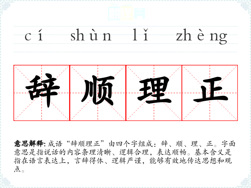 成语“辞顺理正”由四个字组成:辞、顺、理、正。字面意思是指说话的内容条理清晰、逻辑合理,表达顺畅。基本含义是指在语言表达上,言辞得体、逻辑严谨,能够有效地传达思想和观点。