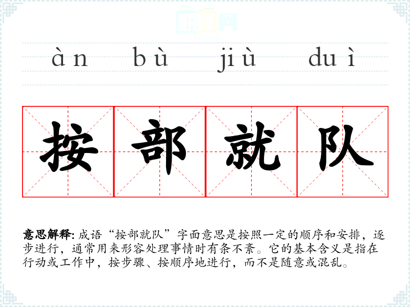 成语“按部就队”字面意思是按照一定的顺序和安排,逐步进行,通常用来形容处理事情时有条不紊。它的基本含义是指在行动或工作中,按步骤、按顺序地进行,而不是随意或混乱。