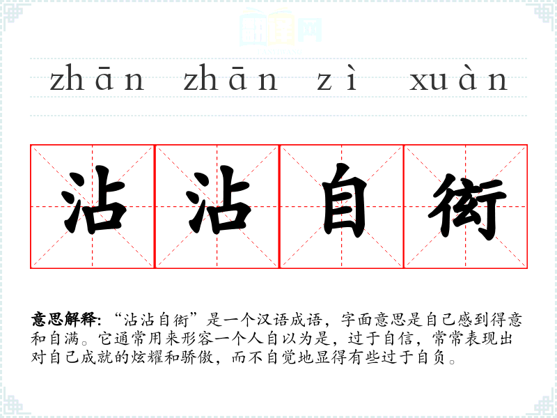 “沾沾自衒”是一个汉语成语,字面意思是自己感到得意和自满。它通常用来形容一个人自以为是,过于自信,常常表现出对自己成就的炫耀和骄傲,而不自觉地显得有些过于自负。