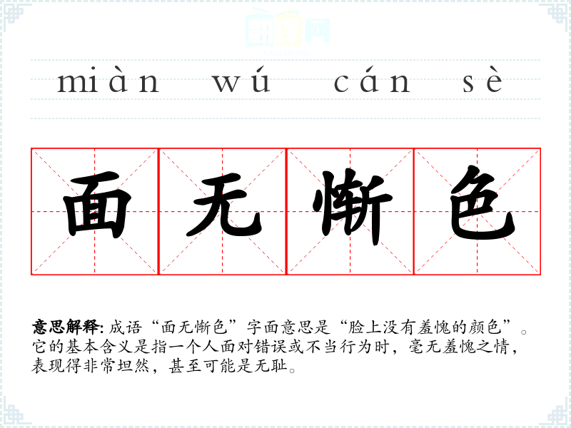 成语“面无惭色”字面意思是“脸上没有羞愧的颜色”。它的基本含义是指一个人面对错误或不当行为时,毫无羞愧之情,表现得非常坦然,甚至可能是无耻。