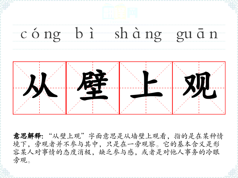 “从壁上观”字面意思是从墙壁上观看,指的是在某种情境下,旁观者并不参与其中,只是在一旁观察。它的基本含义是形容某人对事情的态度消极,缺乏参与感,或者是对他人事务的冷眼旁观。