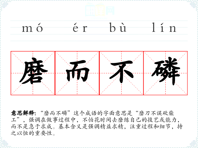 “磨而不磷”这个成语的字面意思是“磨刀不误砍柴工”,强调在做事过程中,不怕花时间去磨练自己的技艺或能力,而不是急于求成。基本含义是强调精益求精,注重过程和细节,持之以恒的重要性。