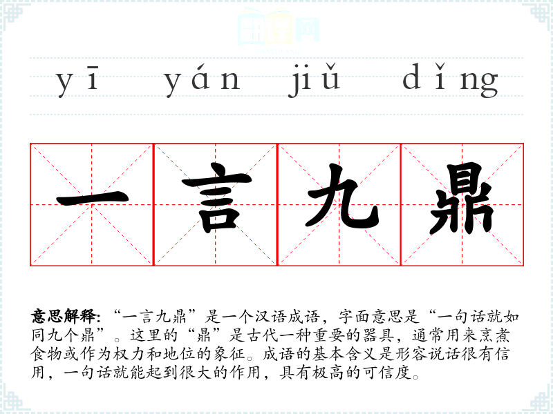 “一言九鼎”是一个汉语成语,字面意思是“一句话就如同九个鼎”。这里的“鼎”是古代一种重要的器具,通常用来烹煮食物或作为权力和地位的象征。成语的基本含义是形容说话很有信用,一句话就能起到很大的作用,具有极高的可信度。