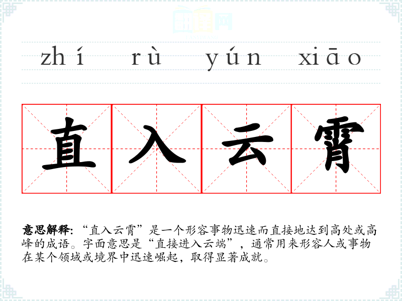 “直入云霄”是一个形容事物迅速而直接地达到高处或高峰的成语。字面意思是“直接进入云端”,通常用来形容人或事物在某个领域或境界中迅速崛起,取得显著成就。