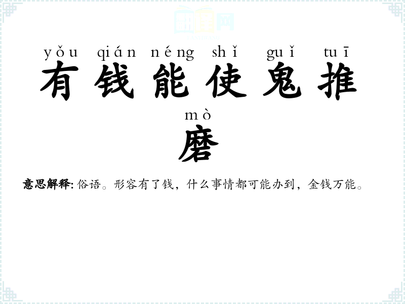 俗语。形容有了钱,什么事情都可能办到,金钱万能。 |