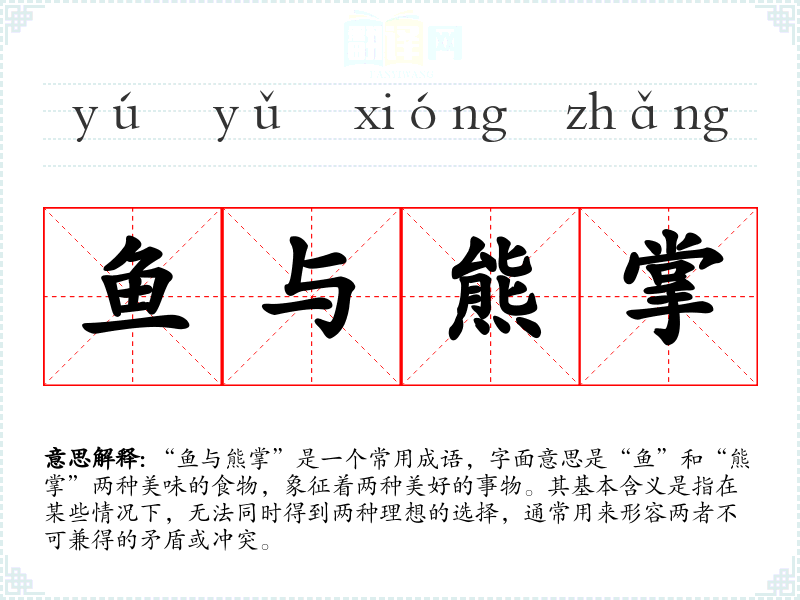 “鱼与熊掌”是一个常用成语,字面意思是“鱼”和“熊掌”两种美味的食物,象征着两种美好的事物。其基本含义是指在某些情况下,无法同时得到两种理想的选择,通常用来形容两者不可兼得的矛盾或冲突。