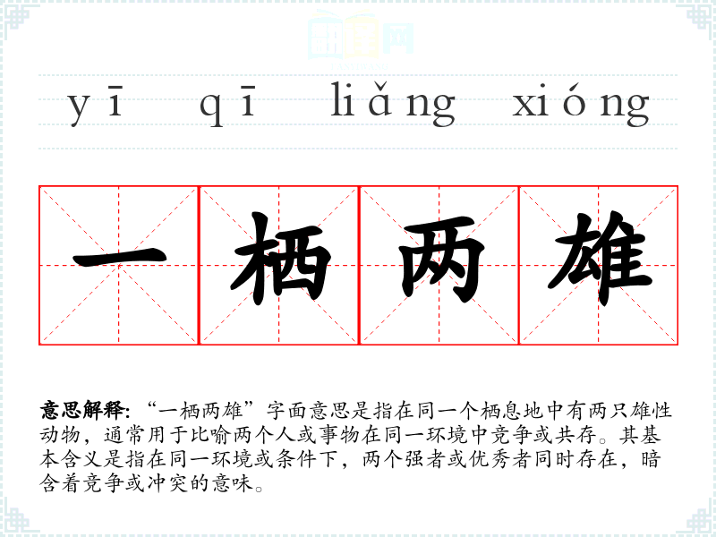 “一栖两雄”字面意思是指在同一个栖息地中有两只雄性动物,通常用于比喻两个人或事物在同一环境中竞争或共存。其基本含义是指在同一环境或条件下,两个强者或优秀者同时存在,暗含着竞争或冲突的意味。
