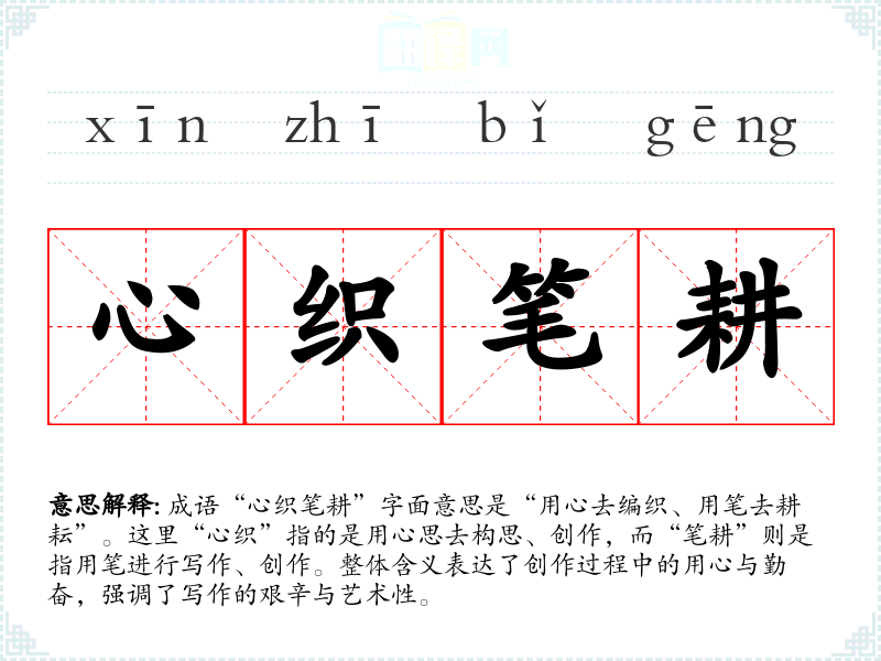 成语“心织笔耕”字面意思是“用心去编织、用笔去耕耘”。这里“心织”指的是用心思去构思、创作,而“笔耕”则是指用笔进行写作、创作。整体含义表达了创作过程中的用心与勤奋,强调了写作的艰辛与艺术性。