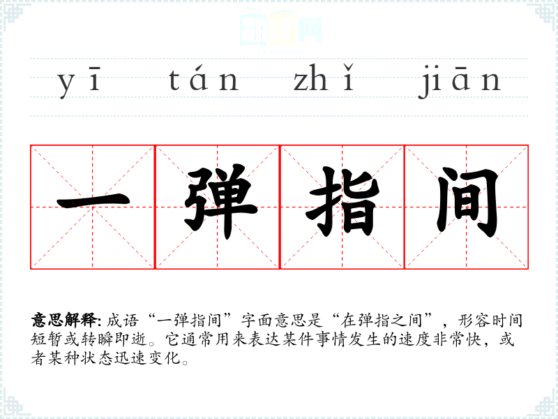 成语“一弹指间”字面意思是“在弹指之间”,形容时间短暂或转瞬即逝。它通常用来表达某件事情发生的速度非常快,或者某种状态迅速变化。
