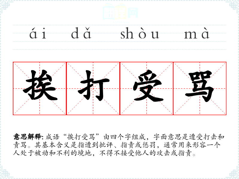 成语“挨打受骂”由四个字组成,字面意思是遭受打击和责骂。其基本含义是指遭到批评、指责或惩罚,通常用来形容一个人处于被动和不利的境地,不得不接受他人的攻击或指责。