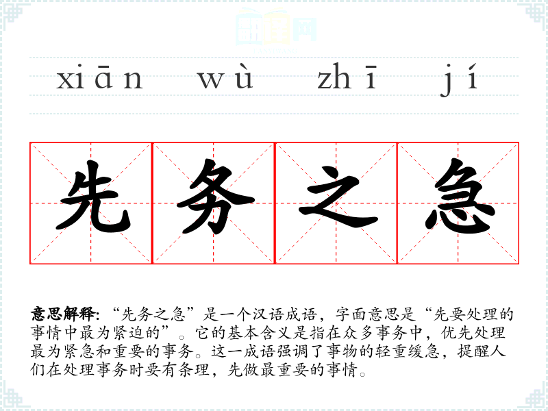 在英语中,可以用“urgent matters”来表达类似的意思,强调处理紧急事务的重要性。然而,中文“先务之急”更强调了先后顺序和逻辑关系,体现了一种更为系统的思维方式。