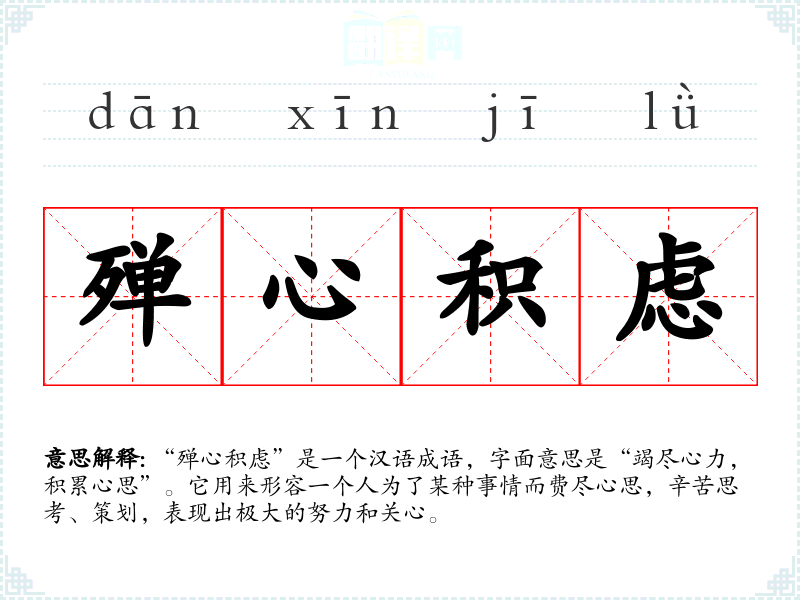 “殚心积虑”是一个汉语成语,字面意思是“竭尽心力,积累心思”。它用来形容一个人为了某种事情而费尽心思,辛苦思考、策划,表现出极大的努力和关心。