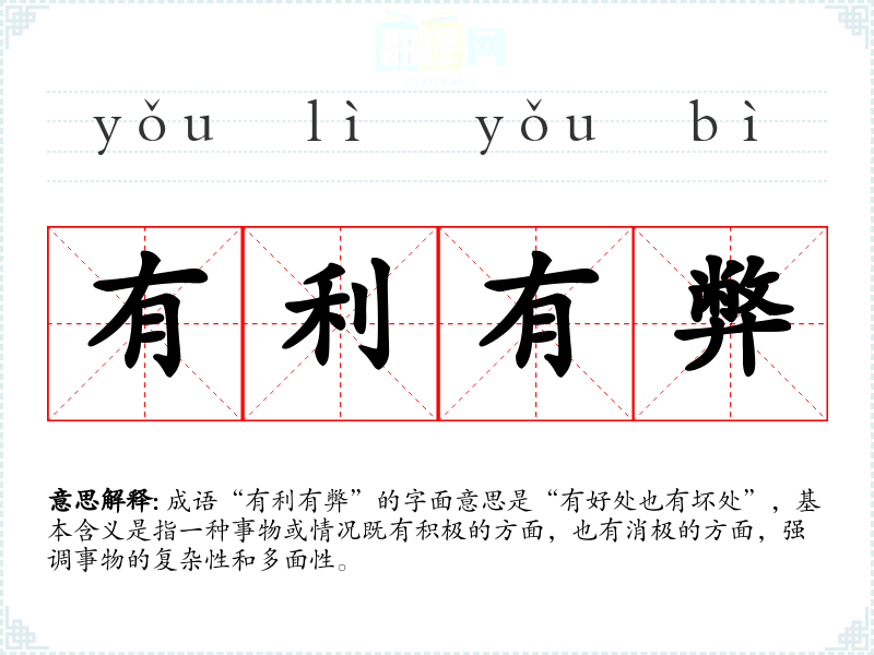 成语“有利有弊”的字面意思是“有好处也有坏处”,基本含义是指一种事物或情况既有积极的方面,也有消极的方面,强调事物的复杂性和多面性。