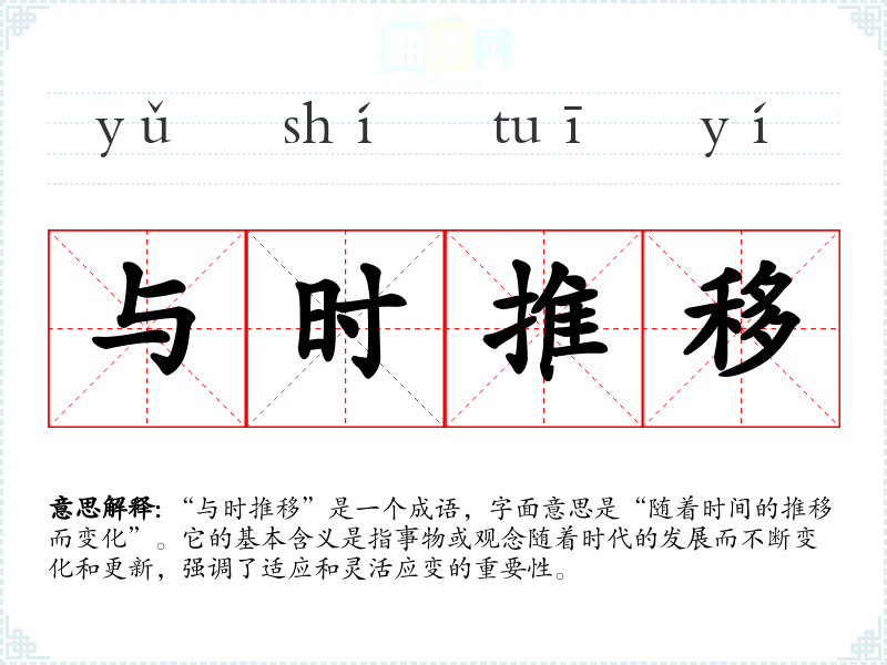 “与时推移”是一个成语,字面意思是“随着时间的推移而变化”。它的基本含义是指事物或观念随着时代的发展而不断变化和更新,强调了适应和灵活应变的重要性。