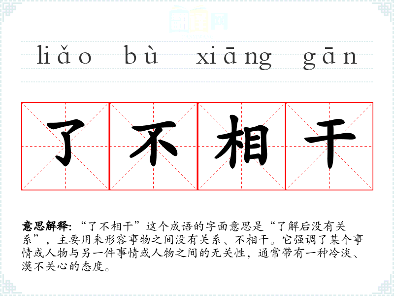 “了不相干”这个成语的字面意思是“了解后没有关系”,主要用来形容事物之间没有关系、不相干。它强调了某个事情或人物与另一件事情或人物之间的无关性,通常带有一种冷淡、漠不关心的态度。