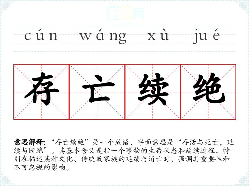 - 日常对话:在讨论传统与现代化冲突时,表达对传统文化的保护,如“我们要关注这些传统的存亡续绝”。