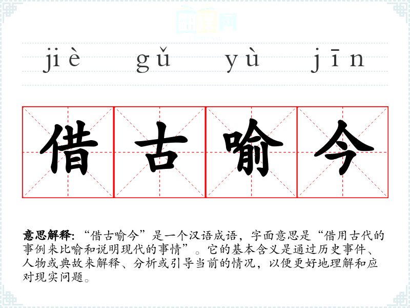 | 借古喻今 | 借:假借;喻:比喻。假借古人古事比喻现实中的今人今事。 |