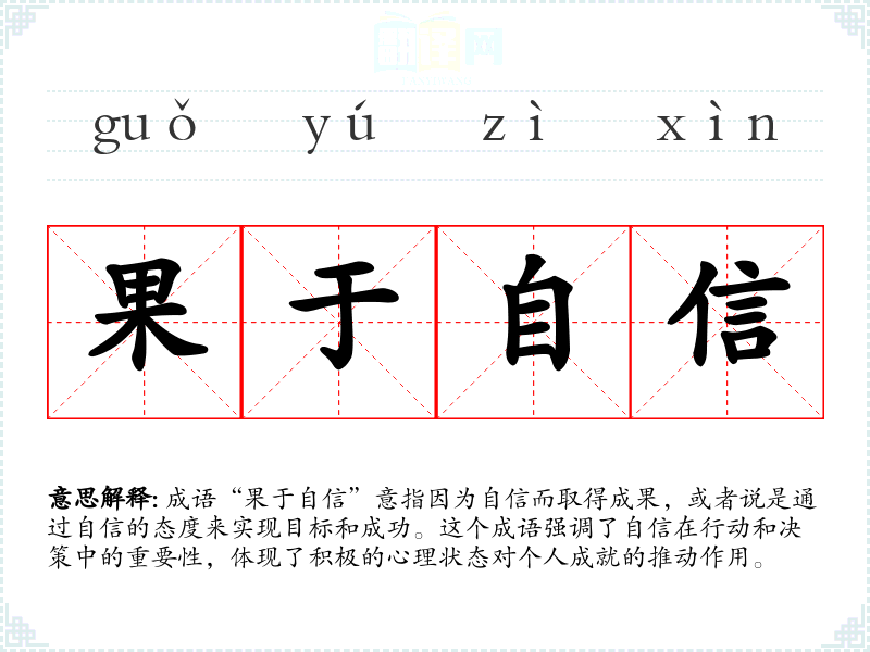 成语“果于自信”意指因为自信而取得成果,或者说是通过自信的态度来实现目标和成功。这个成语强调了自信在行动和决策中的重要性,体现了积极的心理状态对个人成就的推动作用。