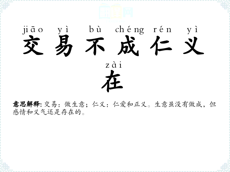 交易:做生意;仁义:仁爱和正义。生意虽没有做成,但感情和义气还是存在的。 |