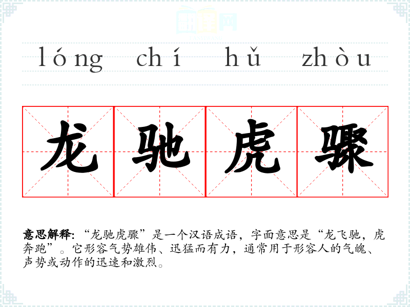 该成语源于古代文学,具体出自《后汉书·王允传》,原文是“龙驰虎骤,风起云涌”。成语中的“龙”和“虎”分别象征着力量与威猛,结合在一起,表达了极具力量和速度的形象。