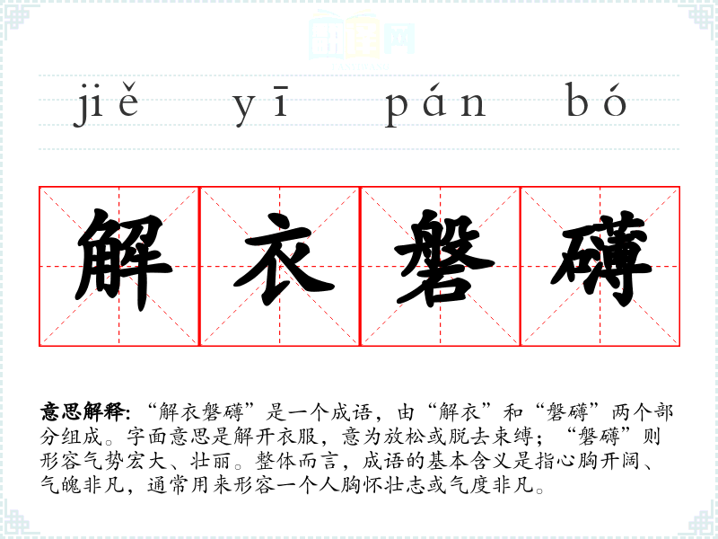 “解衣磐礴”是一个成语,由“解衣”和“磐礴”两个部分组成。字面意思是解开衣服,意为放松或脱去束缚;“磐礴”则形容气势宏大、壮丽。整体而言,成语的基本含义是指心胸开阔、气魄非凡,通常用来形容一个人胸怀壮志或气度非凡。