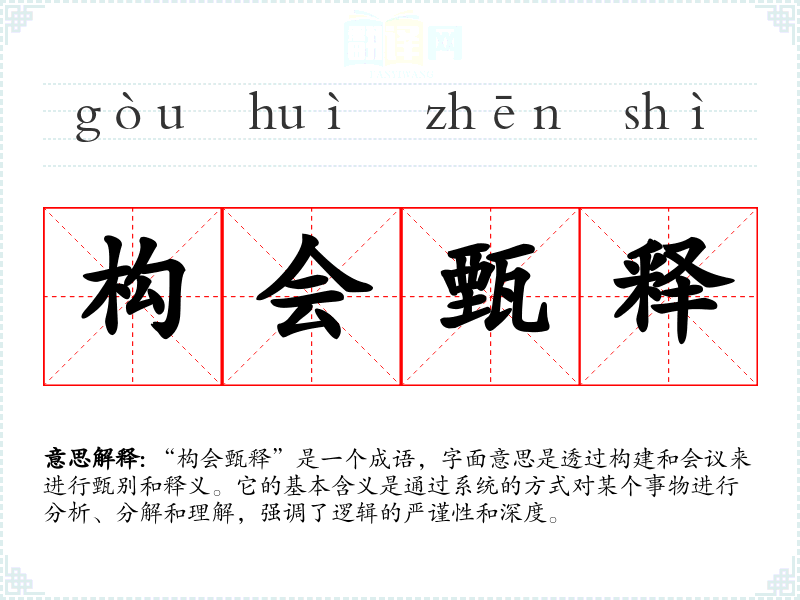 该成语的具体出处不详,可能是近年来在某些专业领域或网络环境中逐渐被使用的。它的构成词汇如“构”、“会”、“甄”、“释”均有明确的中文涵义,分别指构建、汇聚、甄别和解释,显示了在分析过程中的多重步骤。