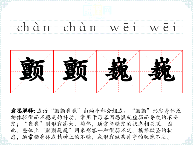 成语“颤颤巍巍”由两个部分组成:“颤颤”形容身体或物体轻微而不稳定的抖动,常用于形容因恐惧或虚弱而导致的不安定;“巍巍”则形容高大、雄伟,通常与稳定的状态相关联。因此,整体上“颤颤巍巍”用来形容一种微弱不定、摇摇欲坠的状态,通常指身体或精神上的不稳,或形容做某件事的犹豫不决。