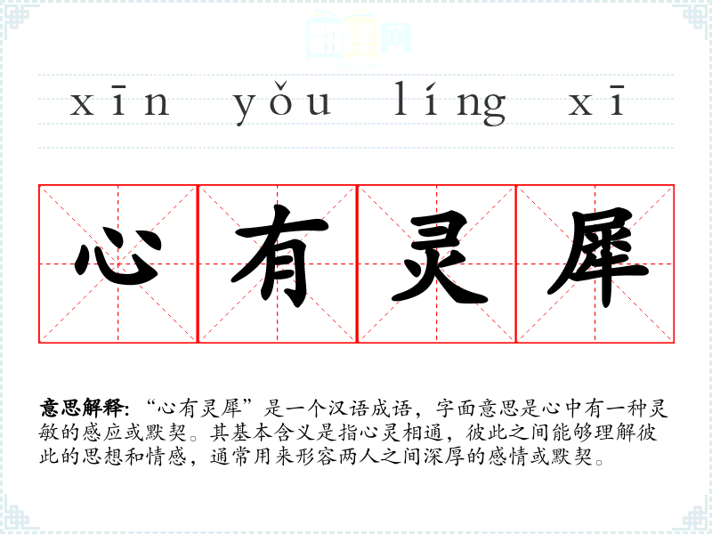 “心有灵犀”是一个汉语成语,字面意思是心中有一种灵敏的感应或默契。其基本含义是指心灵相通,彼此之间能够理解彼此的思想和情感,通常用来形容两人之间深厚的感情或默契。