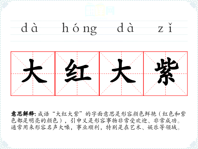 成语“大红大紫”的字面意思是形容颜色鲜艳(红色和紫色都是明亮的颜色),引申义是形容事物非常受欢迎、非常成功。通常用来形容名声大噪,事业顺利,特别是在艺术、娱乐等领域。