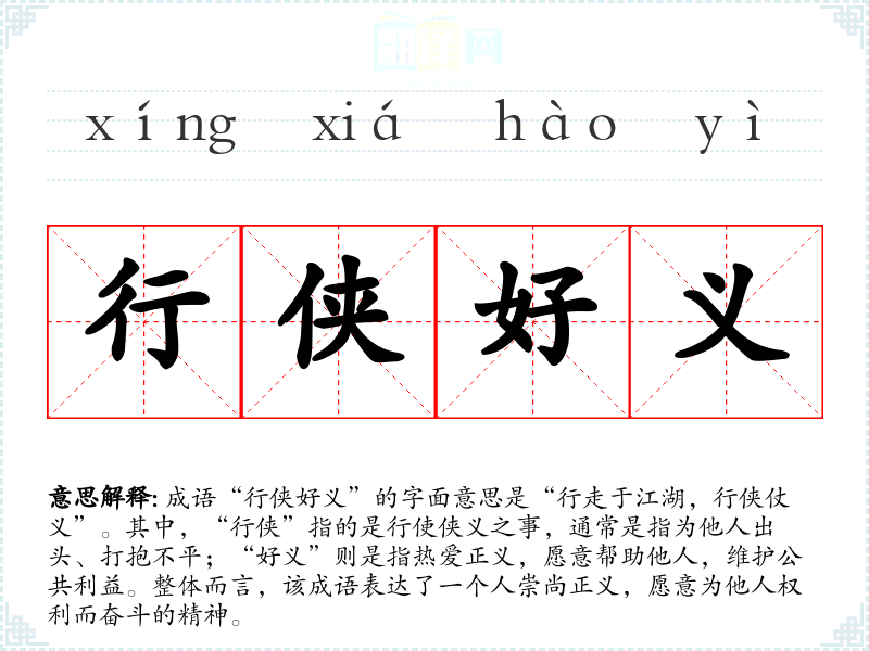| 行侠好义 | 指讲义气,肯舍己助人。 |
