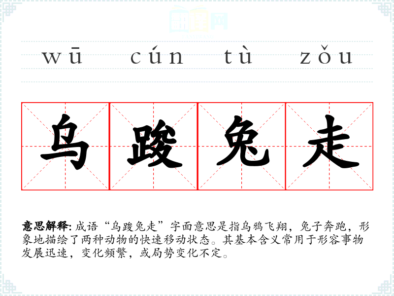 成语“乌踆兔走”字面意思是指乌鸦飞翔,兔子奔跑,形象地描绘了两种动物的快速移动状态。其基本含义常用于形容事物发展迅速,变化频繁,或局势变化不定。