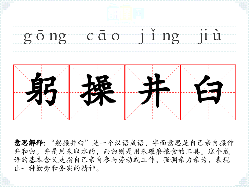 “躬操井臼”是一个汉语成语,字面意思是自己亲自操作井和臼。井是用来取水的,而臼则是用来碾磨粮食的工具。这个成语的基本含义是指自己亲自参与劳动或工作,强调亲力亲为,表现出一种勤劳和务实的精神。