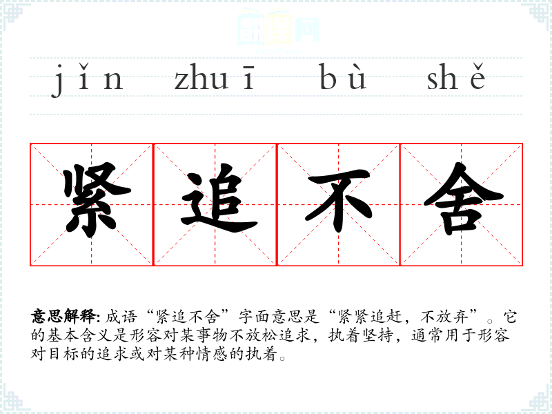 成语“紧追不舍”字面意思是“紧紧追赶,不放弃”。它的基本含义是形容对某事物不放松追求,执着坚持,通常用于形容对目标的追求或对某种情感的执着。
