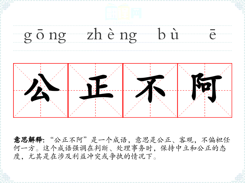 “公正不阿”是一个成语,意思是公正、客观,不偏袒任何一方。这个成语强调在判断、处理事务时,保持中立和公正的态度,尤其是在涉及利益冲突或争执的情况下。