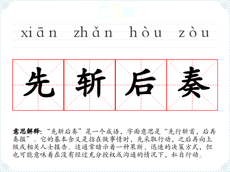 “先斩后奏”是一个成语,字面意思是“先行斩首,后再奏报”。它的基本含义是指在做事情时,先采取行动,之后再向上级或相关人士报告。这通常暗示着一种果断、迅速的决策方式,但也可能意味着在没有经过充分授权或沟通的情况下,私自行动。