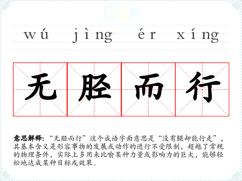 “无胫而行”这个成语字面意思是“没有腿却能行走”,其基本含义是形容事物的发展或动作的进行不受限制,超越了常规的物理条件,实际上多用来比喻某种力量或影响力的巨大,能够轻松地达成某种目标或效果。