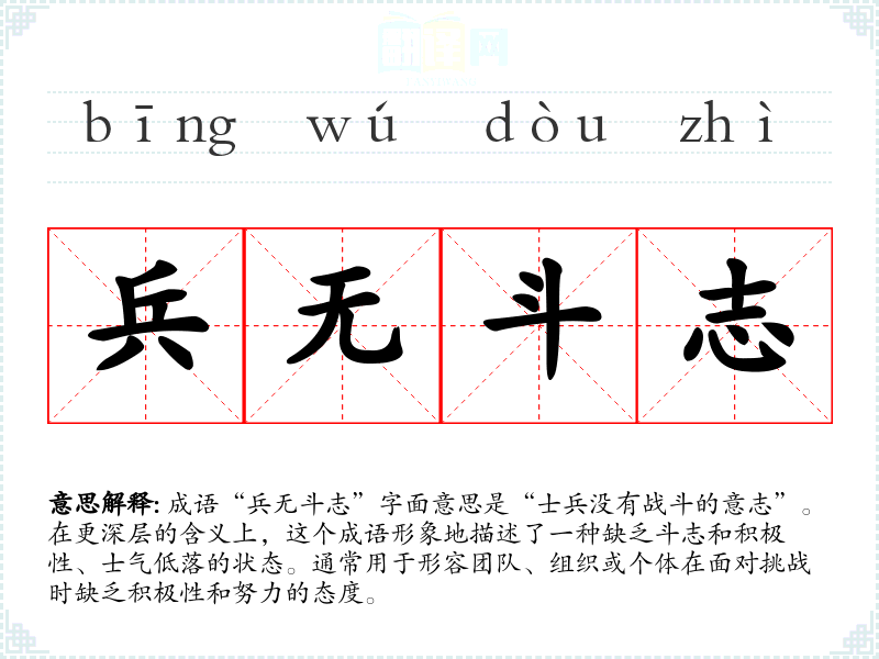 成语“兵无斗志”字面意思是“士兵没有战斗的意志”。在更深层的含义上,这个成语形象地描述了一种缺乏斗志和积极性、士气低落的状态。通常用于形容团队、组织或个体在面对挑战时缺乏积极性和努力的态度。