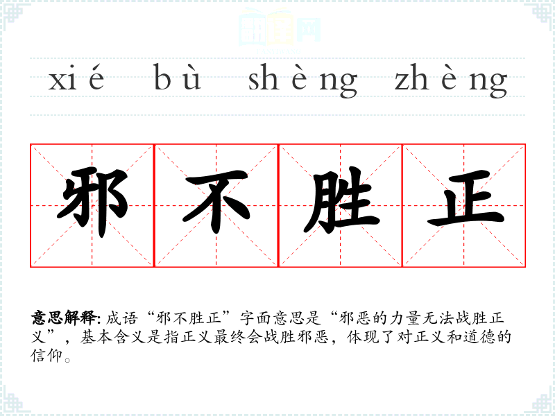 成语“邪不胜正”字面意思是“邪恶的力量无法战胜正义”,基本含义是指正义最终会战胜邪恶,体现了对正义和道德的信仰。