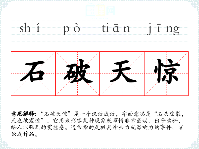 “石破天惊”是一个汉语成语,字面意思是“石头破裂,天也被震惊”。它用来形容某种现象或事情非常轰动、出乎意料,给人以强烈的震撼感。通常指的是极具冲击力或影响力的**、言论或作品。