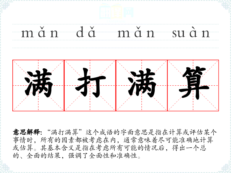 “满打满算”这个成语的字面意思是指在计算或评估某个事情时,所有的因素都被考虑在内,通常意味着尽可能准确地计算或估算。其基本含义是指在考虑所有可能的情况后,得出一个总的、全面的结果,强调了全面性和准确性。