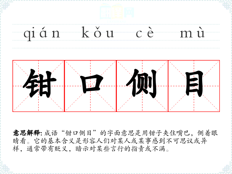 成语“钳口侧目”的字面意思是用钳子夹住嘴巴,侧着眼睛看。它的基本含义是形容人们对某人或某事感到不可思议或异样,通常带有贬义,暗示对某些言行的指责或不满。
