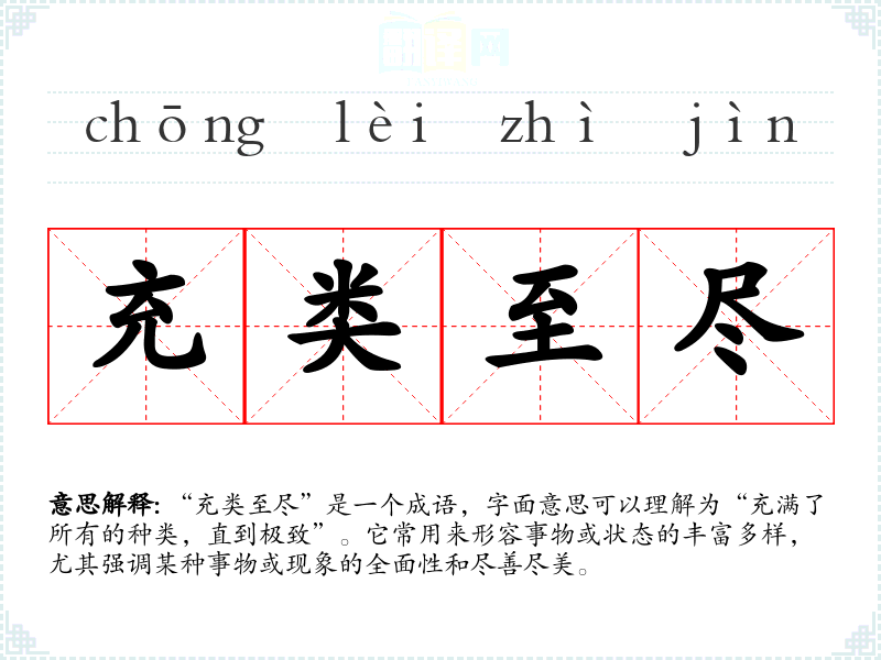 “充类至尽”是一个成语,字面意思可以理解为“充满了所有的种类,直到极致”。它常用来形容事物或状态的丰富多样,尤其强调某种事物或现象的全面性和尽善尽美。
