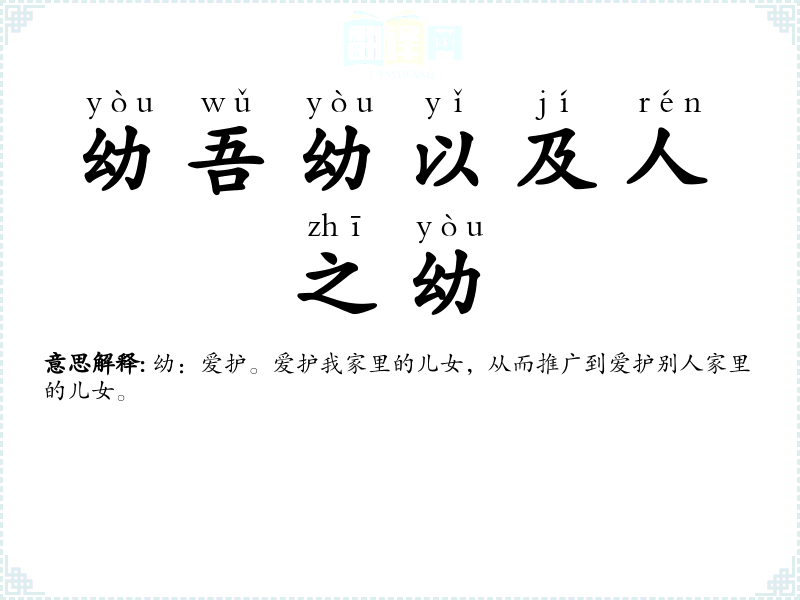幼:爱护。爱护我家里的儿女,从而推广到爱护别人家里的儿女。 |