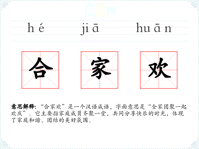 - 演讲:在有关家庭和谐或社会和谐的主题演讲中,可以引用“合家欢”来强调家庭的重要性。