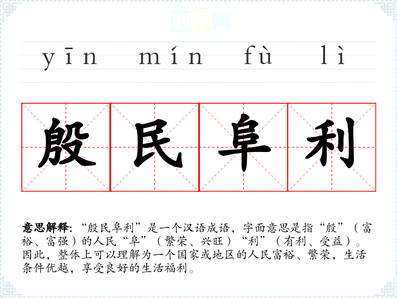 “殷民阜利”是一个汉语成语,字面意思是指“殷”(富裕、富强)的人民“阜”(繁荣、兴旺)“利”(有利、受益)。因此,整体上可以理解为一个国家或地区的人民富裕、繁荣,生活条件优越,享受良好的生活福利。