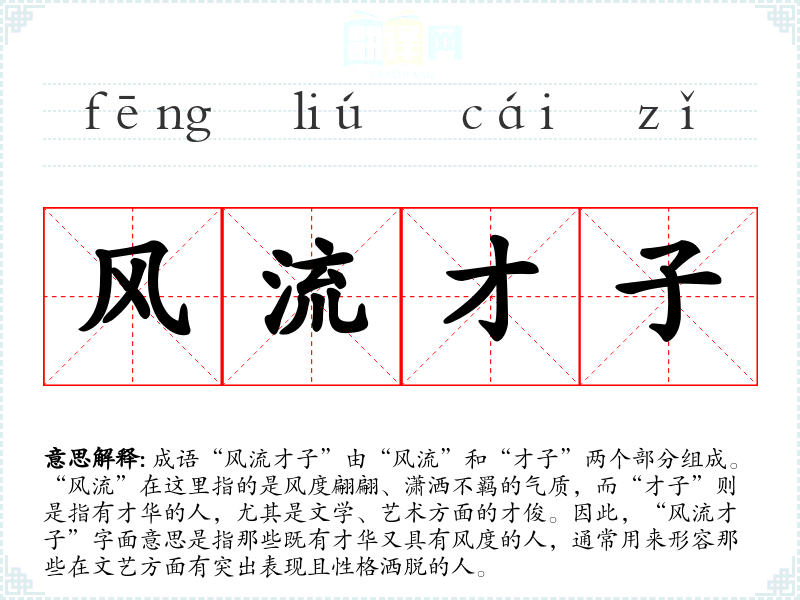 成语“风流才子”由“风流”和“才子”两个部分组成。“风流”在这里指的是风度翩翩、潇洒不羁的气质,而“才子”则是指有才华的人,尤其是文学、艺术方面的才俊。因此,“风流才子”字面意思是指那些既有才华又具有风度的人,通常用来形容那些在文艺方面有突出表现且性格洒脱的人。